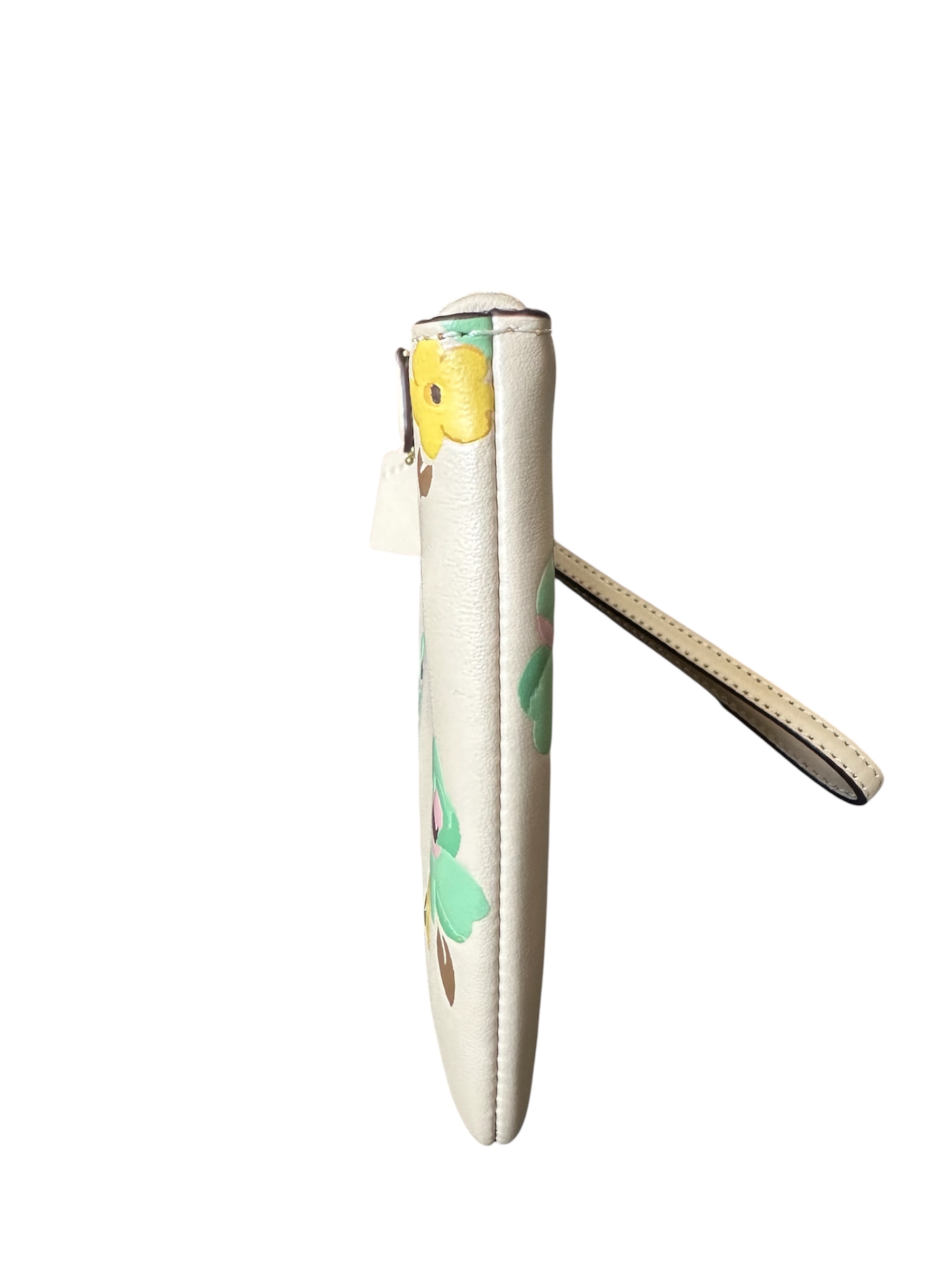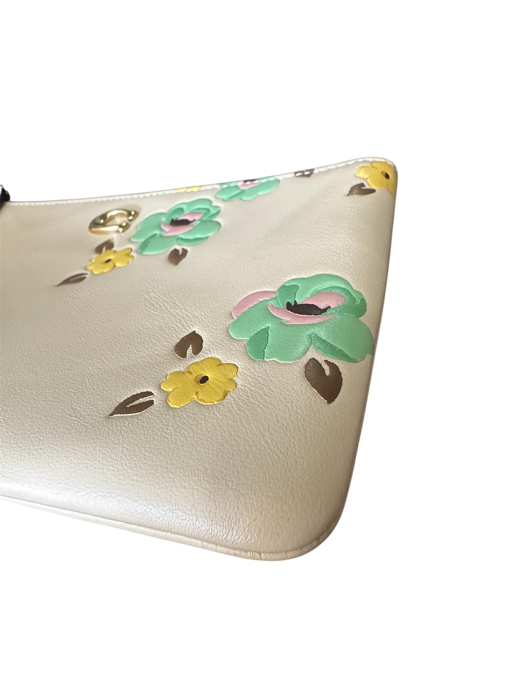 O modelo na cor nude possui flores, metais em ferragens douradas, alça removível e fecho em zíper.