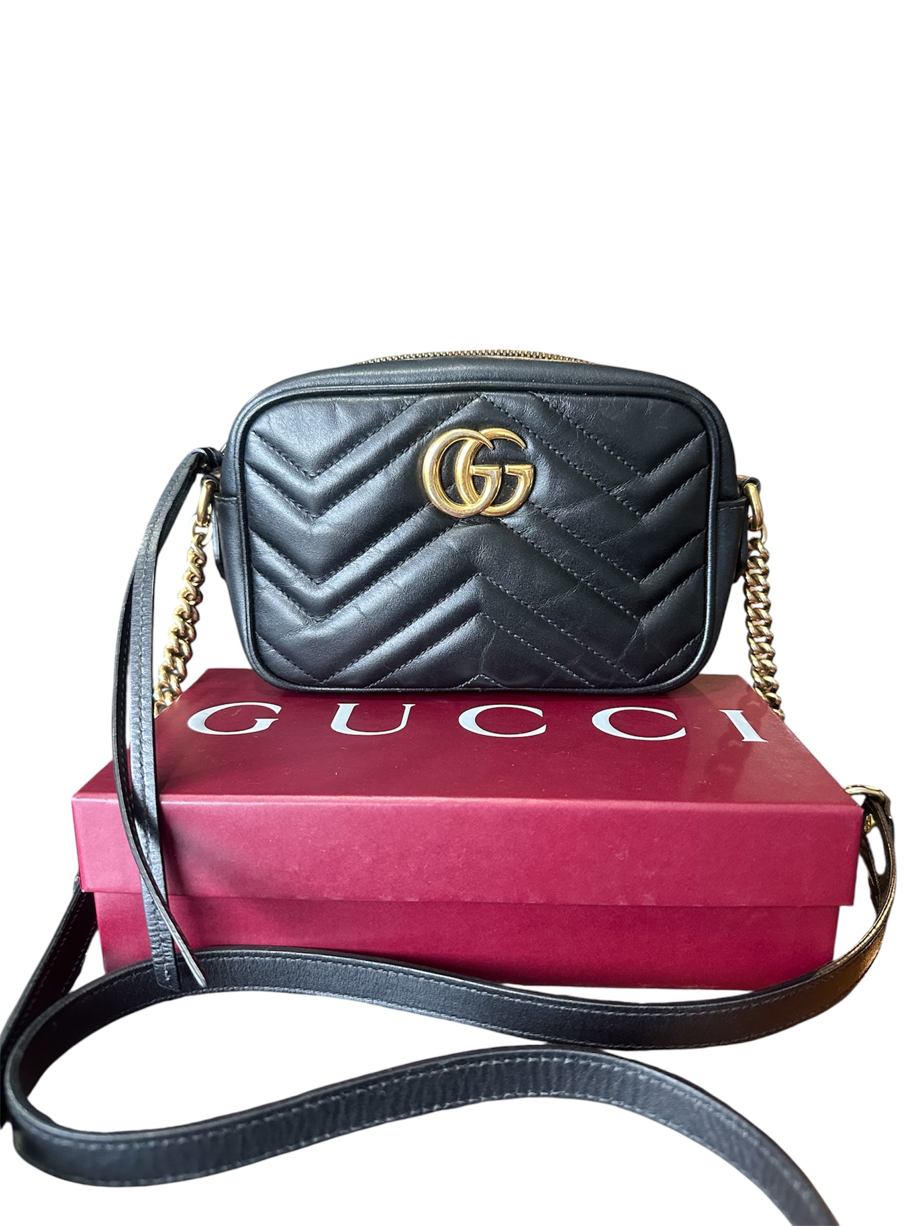 O modelo possui ferragens douradas, GG na parte frontal e alça longa de metal e couro. Acompanha caixa e dust.