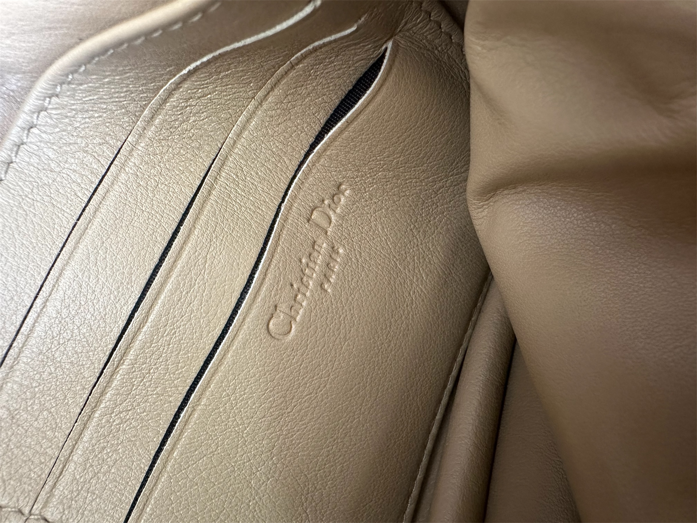 O modelo possui um chaveiro com as inicias da Dior, fecho por botão e repartições para cartões na parte interna.