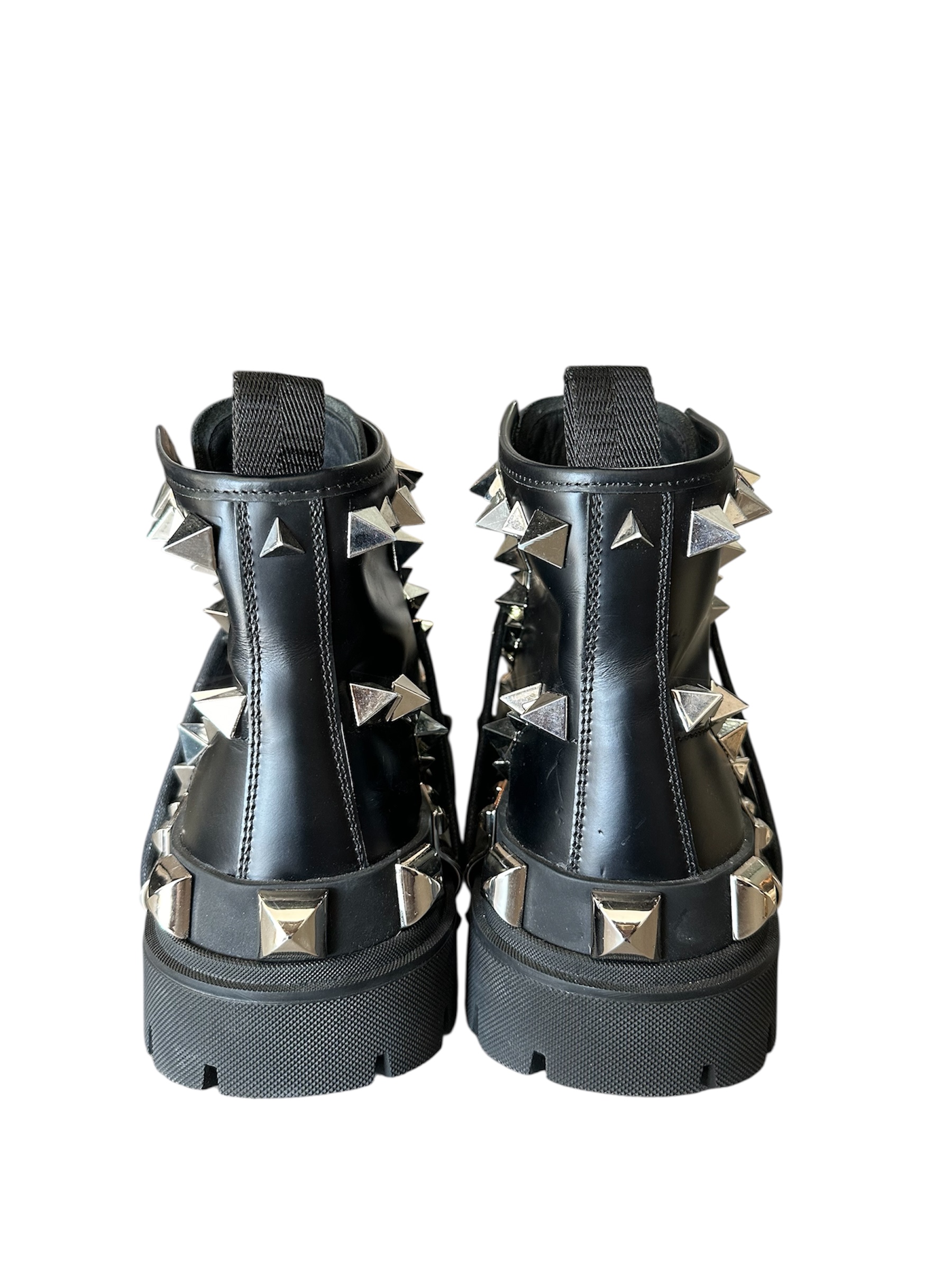 O modelo possui tachas em ferragem prata e salto tratorado e cadarço.