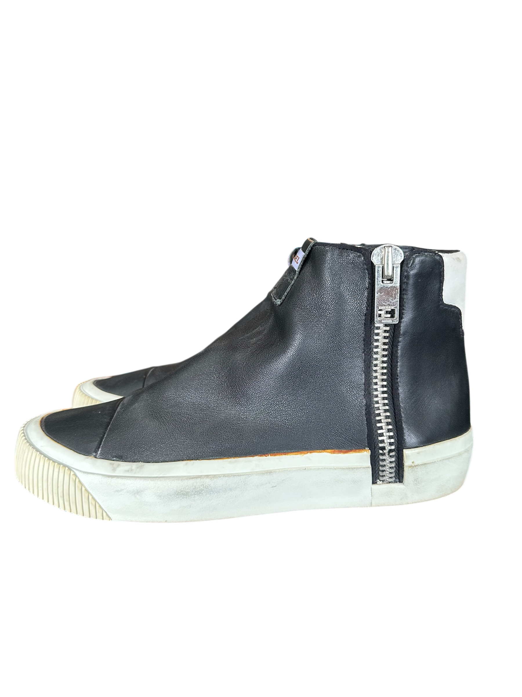 O modelo botinha na cor preta, possui zíper nas laterais e etiqueta da marca na parte frontal.